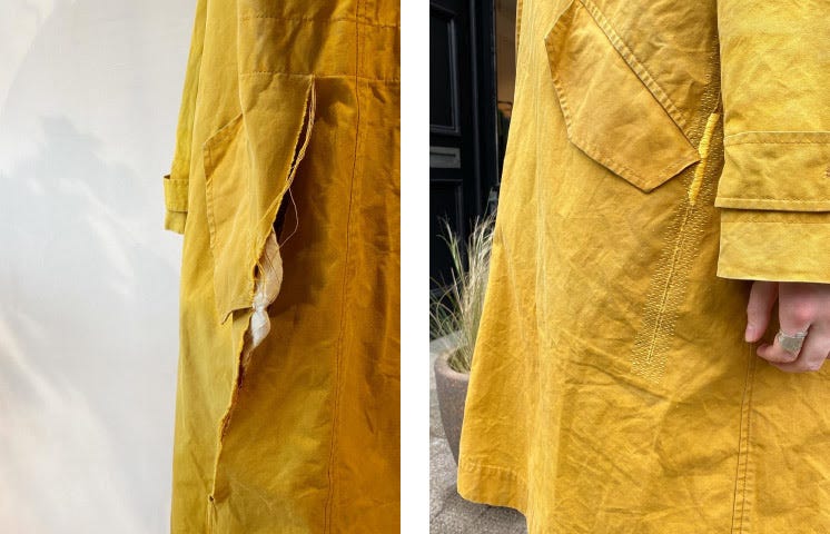 Their in-house repair team of six specialists carefully mend each garment, taking fabric, color and texture into consideration. The unique stitching on each piece prolongs its use.