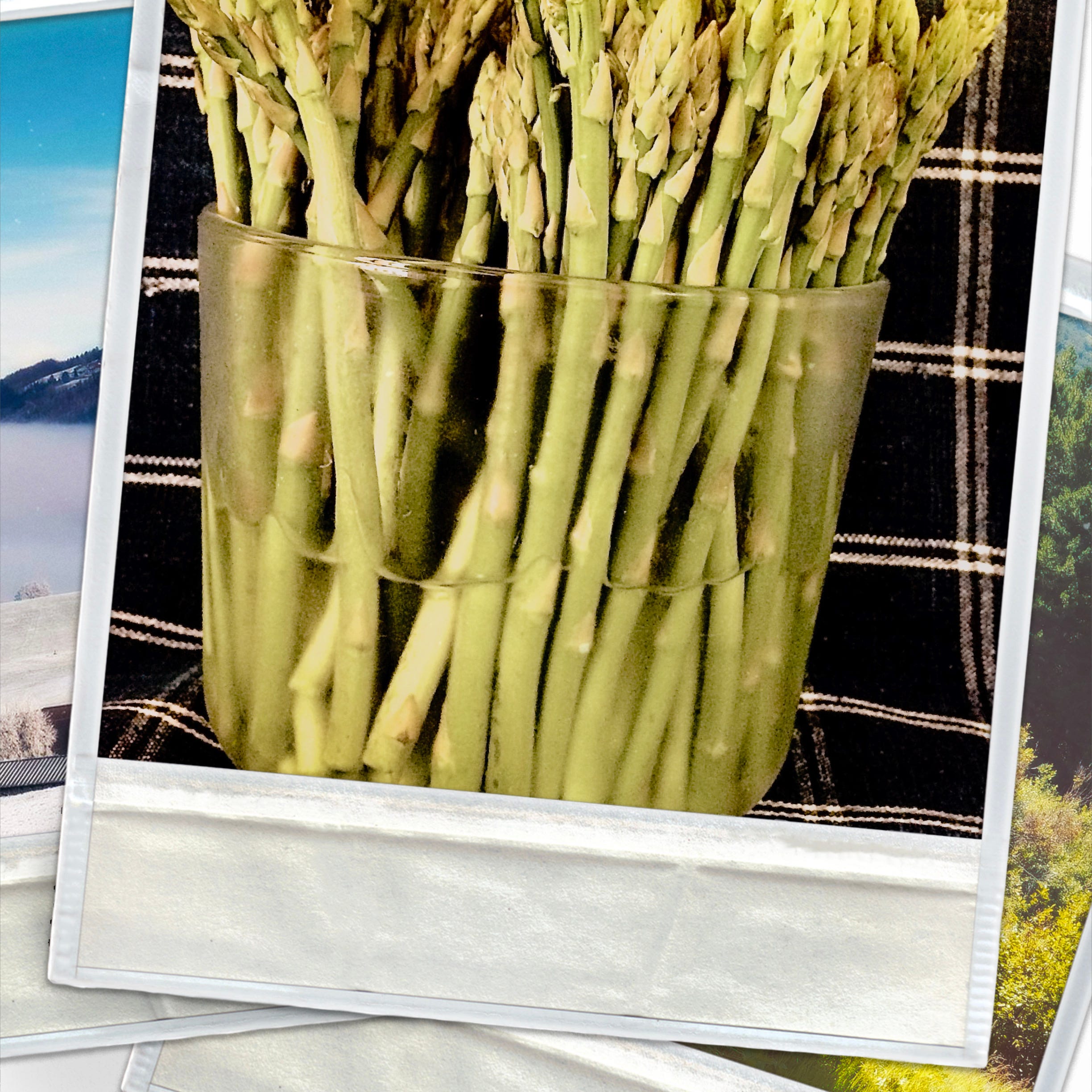 This is how I store asparagus in the fridge. Stand them in a water filled glass container helps to keeps them fresh.